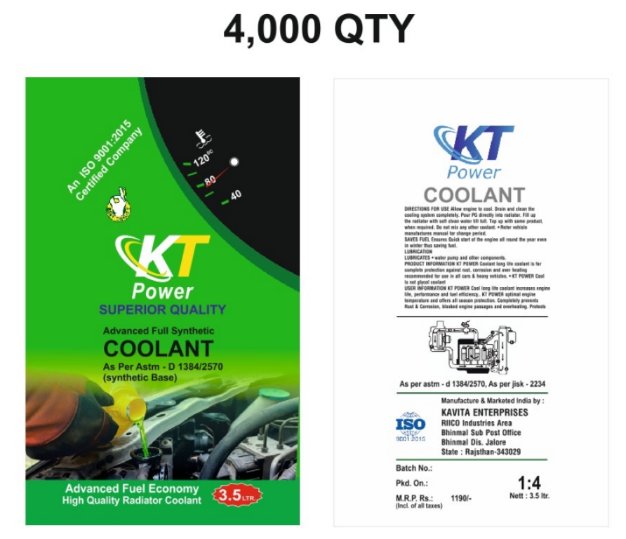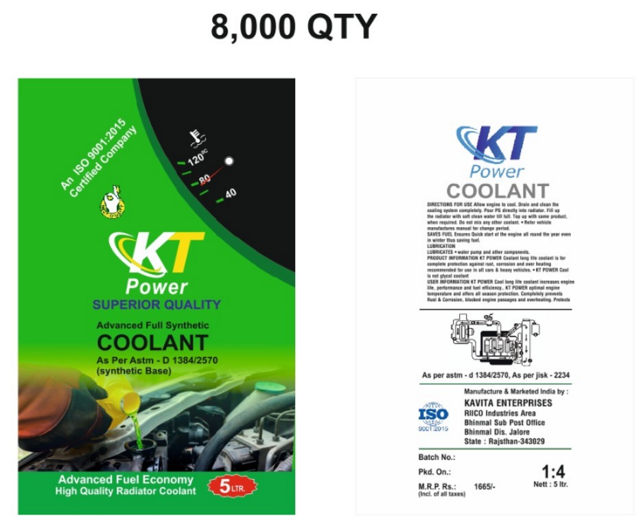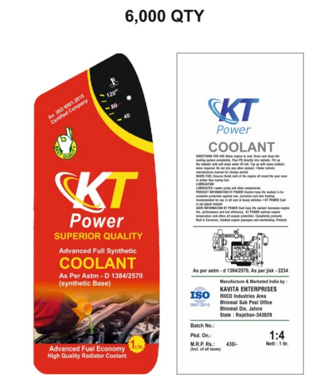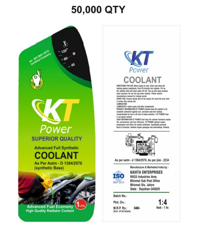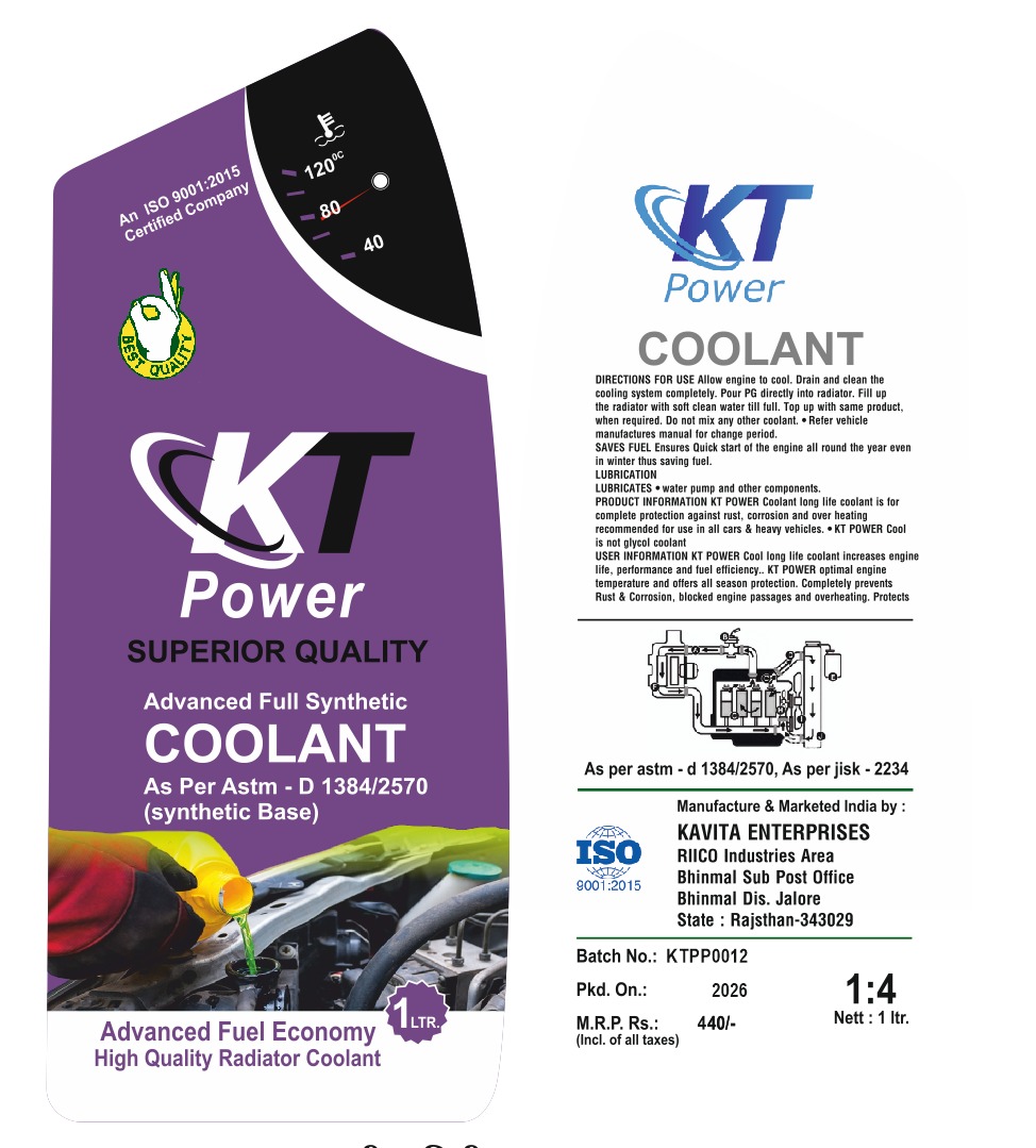 Kavita Enterprise, established in 2025 and headquartered in Jalore, Rajasthan (India), is a fast-growing manufacturing company operating under the trusted brand name KT POWER. We specialize in the production of high-performance Radiator Coolant and automotive fluids, engineered to deliver superior engine protection and long-lasting performance. As a quality-focused manufacturer, we combine advanced formulations with stringent quality control standards to ensure that every product meets industry benchmarks. Our commitment to innovation, reliability, and customer satisfaction has positioned KT POWER as an emerging and dependable brand in the automotive chemical segment.